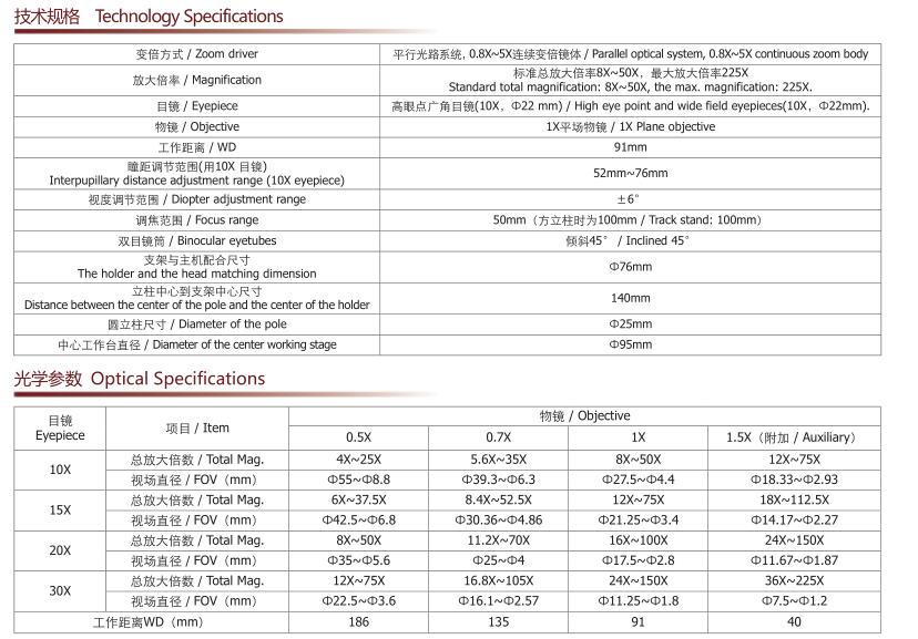 ● 采用平行光学系统,主体连续变倍范围0.8X~5X